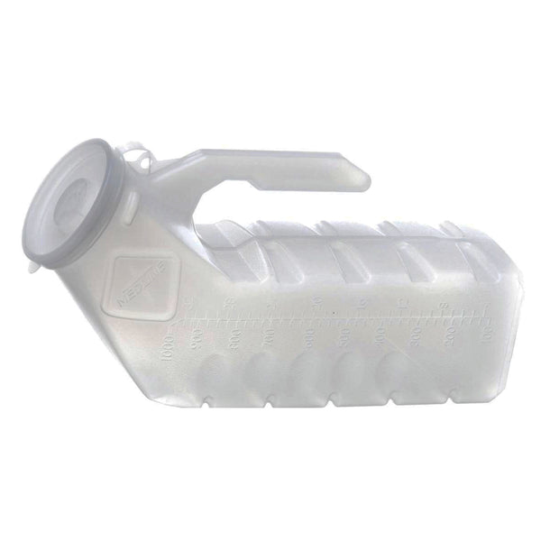 Mini Translucent Male Urinal. Splash-proof lid and store on their side, preventing accidental tipping and spilling. Graduated in ounces and milliliters. Measured volume of 32-oz./1,000 ml.