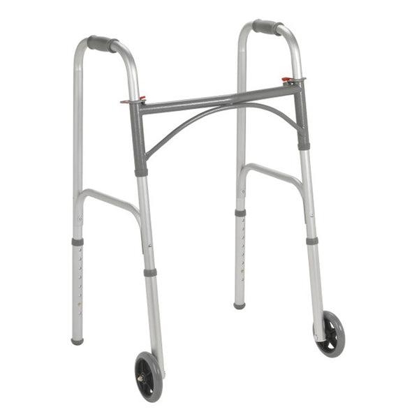 2-Button Walker with 5" Wheels, Push-Button Release Mechanisms, 1" Diameter Construction, 32" - 39" Adjustable Handle Height, 24" Overall Width (20" Width Inside Back Legs, 17" Width Inside Hand Grip), 350 lbs. Weight Capacity.