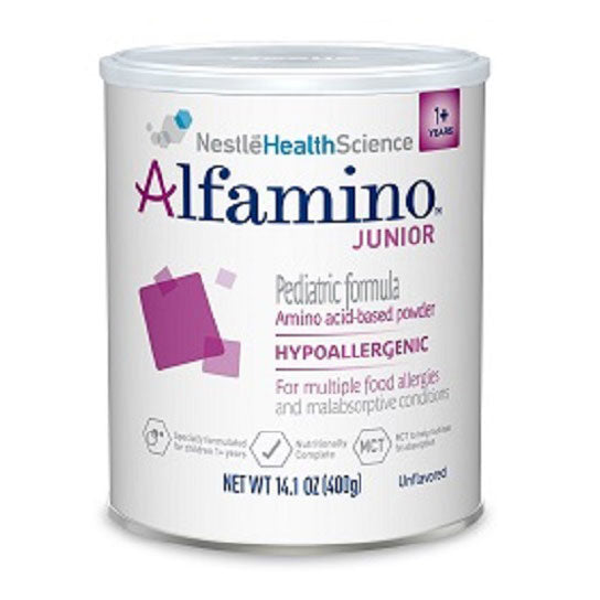 Alfamino Junior Unflavored Powder 14.1 oz (400 g), 1,840 Calories Per Can. Appropriate for cow's milk protein allergy, multiple food allergies, and conditions of severe maldigestion and malabsorption. Complete source of nutrition gluten-free, lactose-free and easy to digest.