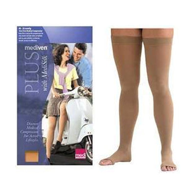 Mediven Plus Thigh-High with Beaded Silicone Band, 40-50 mmHg, Petite, Open Toe, Beige, Size 5.